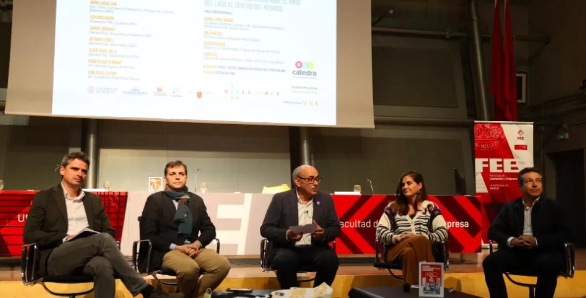 Tras la inauguración, la Cátedra de RSC de la UMU organizó la mesa redonda ‘Sostenibilidad: el paso del lado al centro del negocio’, en la que directivos de Hero, Estrella de Levante, Emuasa y de la banca online Imagin de Caixabank ofrecieron su visión de la sostenibilidad y la importancia que le conceden en sus relaciones de negocio. Además, ilustraron con ejemplos concretos de cómo la sostenibilidad y RSC han pasado a ser una palanca de innovación para aumentar su competitividad.