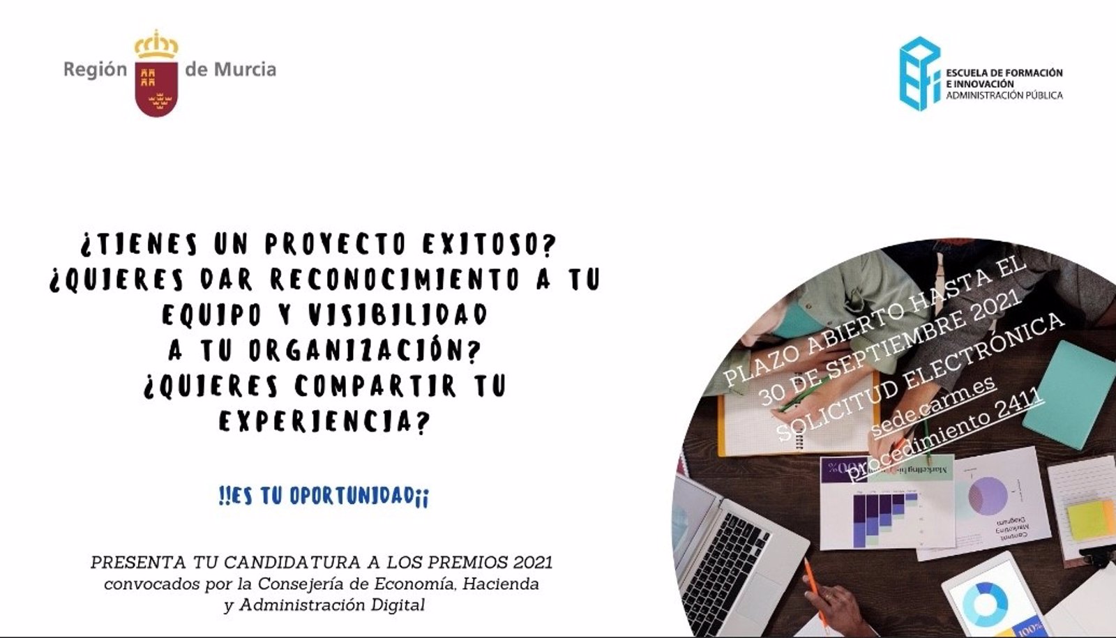 La Consejería de Economía, Hacienda y Administración Digital busca las mejores prácticas en las diferentes administraciones públicas y entidades existentes dentro del ámbito territorial de la Región de Murcia, tanto la administración regional como la local y las universidades públicas, para reconocer estas iniciativas y darlas a conocer como experiencias de éxito.