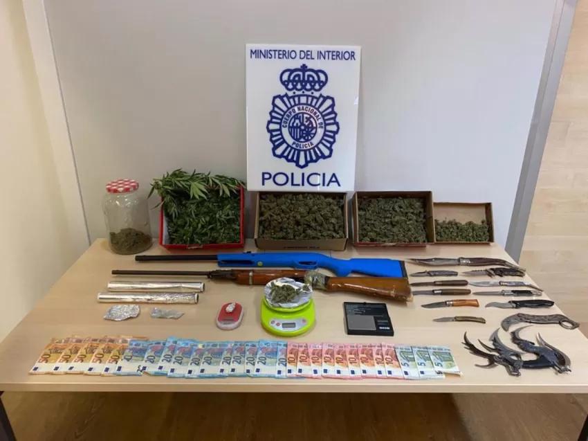 En los mismos se intervinieron dos escopetas de aire comprimido, un puño americano, diversas armas blancas (puñales y navajas), 575 euros en moneda fraccionada, balanzas de precisión y diversas partidas de sustancia estupefaciente preparadas para su venta.