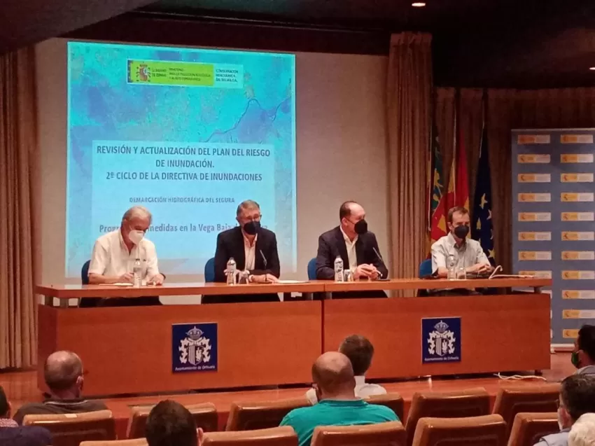 El presidente de la Confederación Hidrográfica del Segura (CHS) ha presentado este miércoles en Orihuela (Alicante), en una jornada informativa, a la Generalitat Valenciana y a los alcaldes de la cuenca del Segura en la provincia los dos proyectos tanto el Plan de Gestión de Riesgo de Inundaciones como el anteproyecto de soluciones para prevenir el riesgo de avenidas en la Vega Baja.