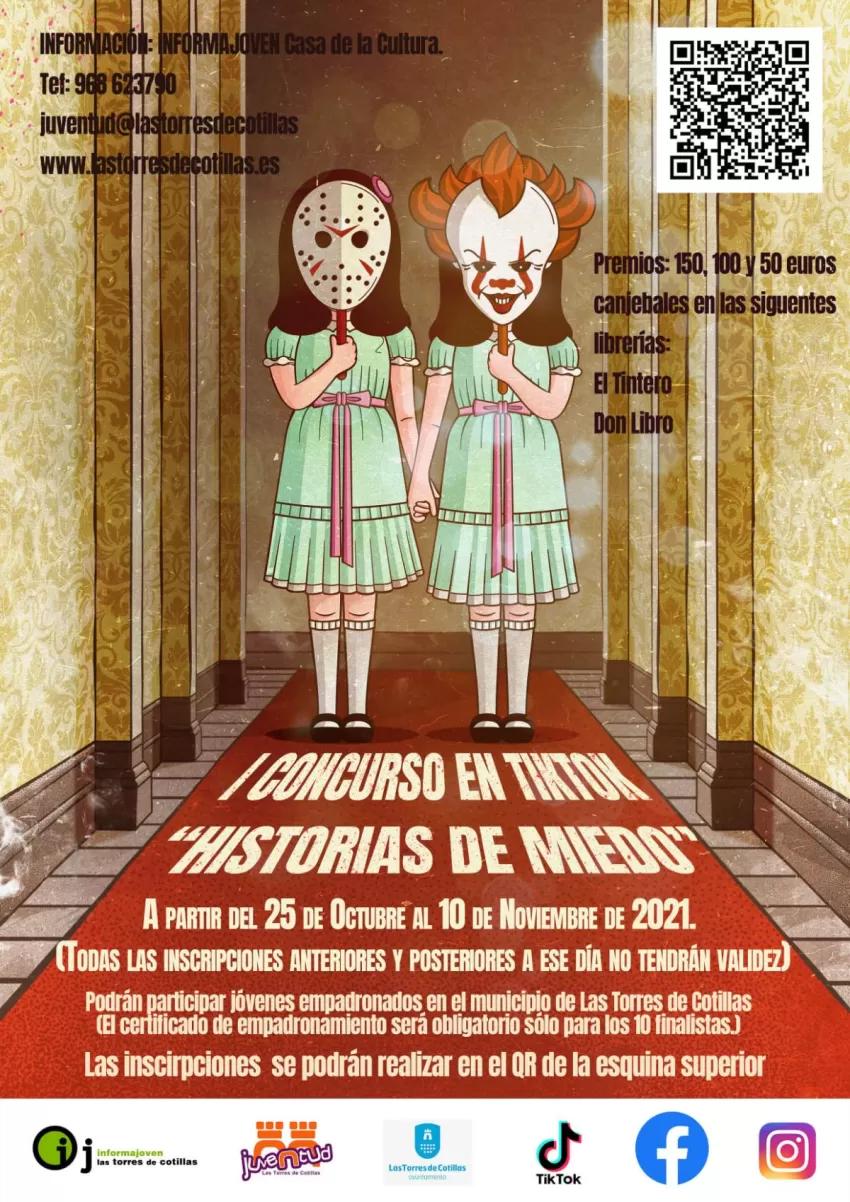 El concurso audiovisual 'Historias de miedo', organizado por la Concejalía de Juventud de Las Torres de Cotillas y que tendrá como plataforma la red social Tik Tok, entra en su recta final. El período de inscripción se cierra el 10 de noviembre y podrán presentarse jóvenes empadronados en el municipio. Las bases de este concurso y el formulario de inscripción se pueden encontrar en https://bit.ly/3AYPsGY.