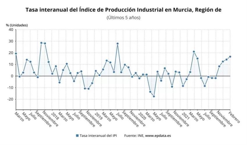 El Índice General de Producción Industrial (IPI) aumentó en la Región de Murcia un 16,7% en febrero respecto al mismo mes del año anterior, la mayor tasa de todas las comunidades, frente al incremento del 3,9% de la media nacional, según los datos publicados por el Instituto Nacional de Estadística (INE) este viernes.