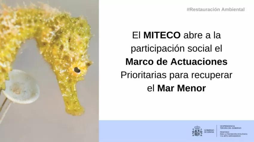 El Ministerio para la Transición Ecológica y el Reto Demográfico (MITECO) ha abierto este viernes a proceso de participación pública el Marco de Actuaciones Prioritarias para recuperar el Mar Menor, cuyas medidas, calendario y presupuesto estimado presentó este jueves en Murcia la vicepresidenta y ministra, Teresa Ribera.
