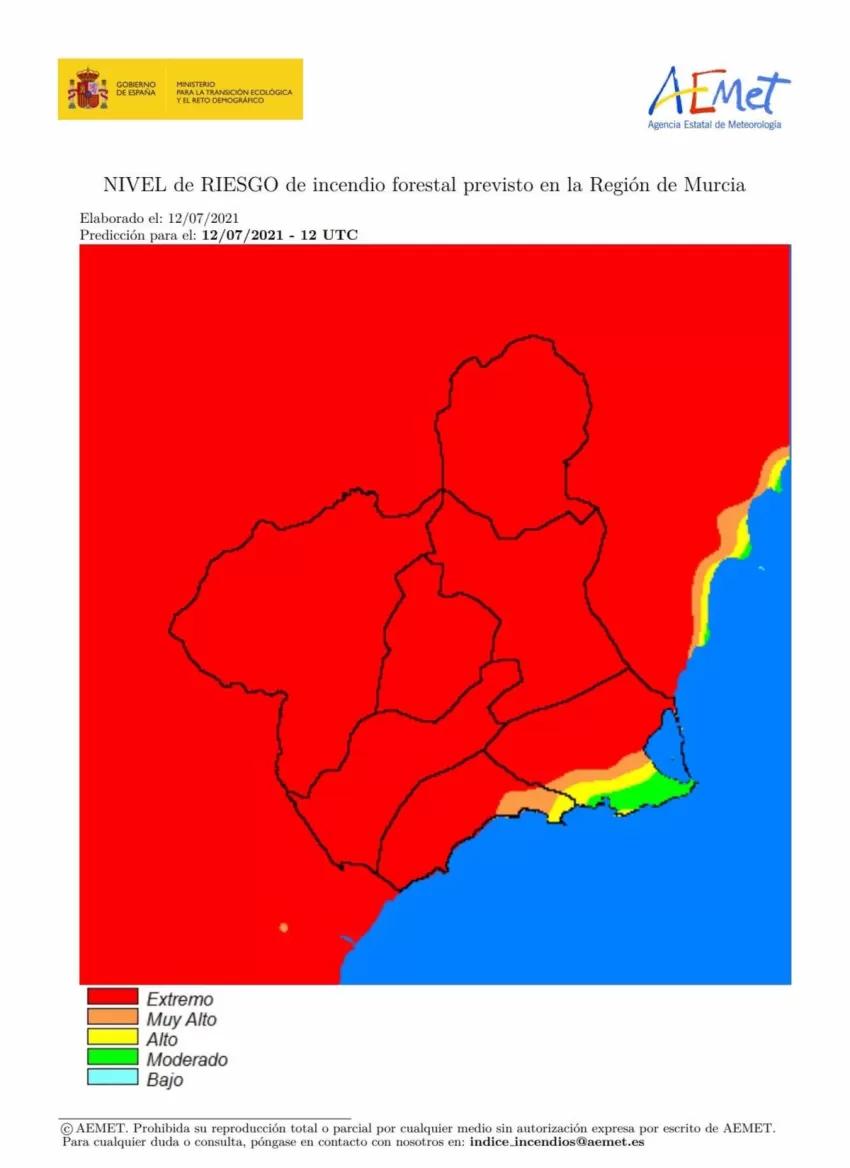 El nivel de riesgo de incendio forestal previsto por la Agencia Estatal de Meteorología para este lunes es extremo en prácticamente toda la Región de Murcia.
