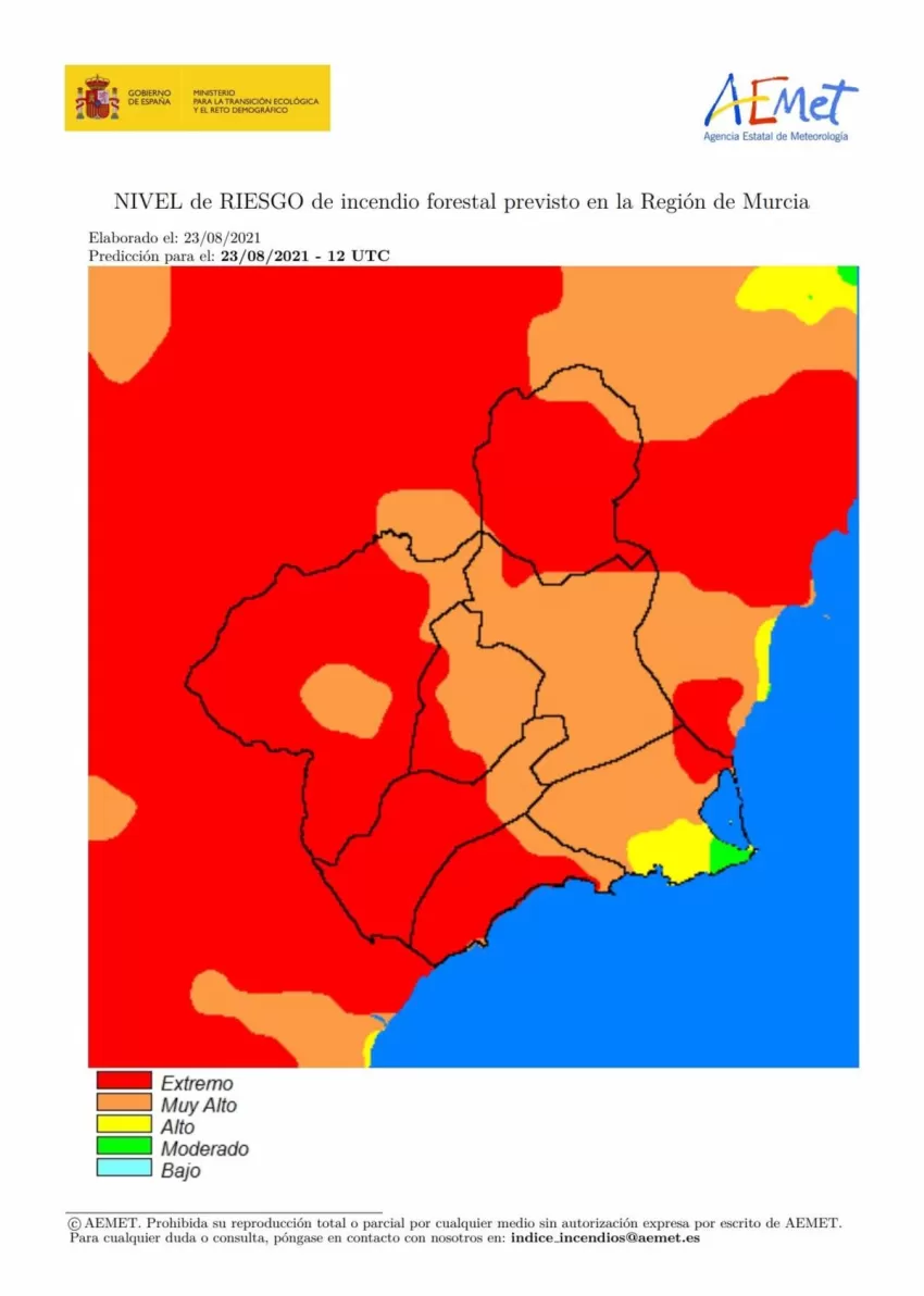 El nivel de riesgo de incendio forestal previsto por la Agencia Estatal de Meteorología (Aemet) para este lunes es extremo o muy alto en toda la Región de Murcia.