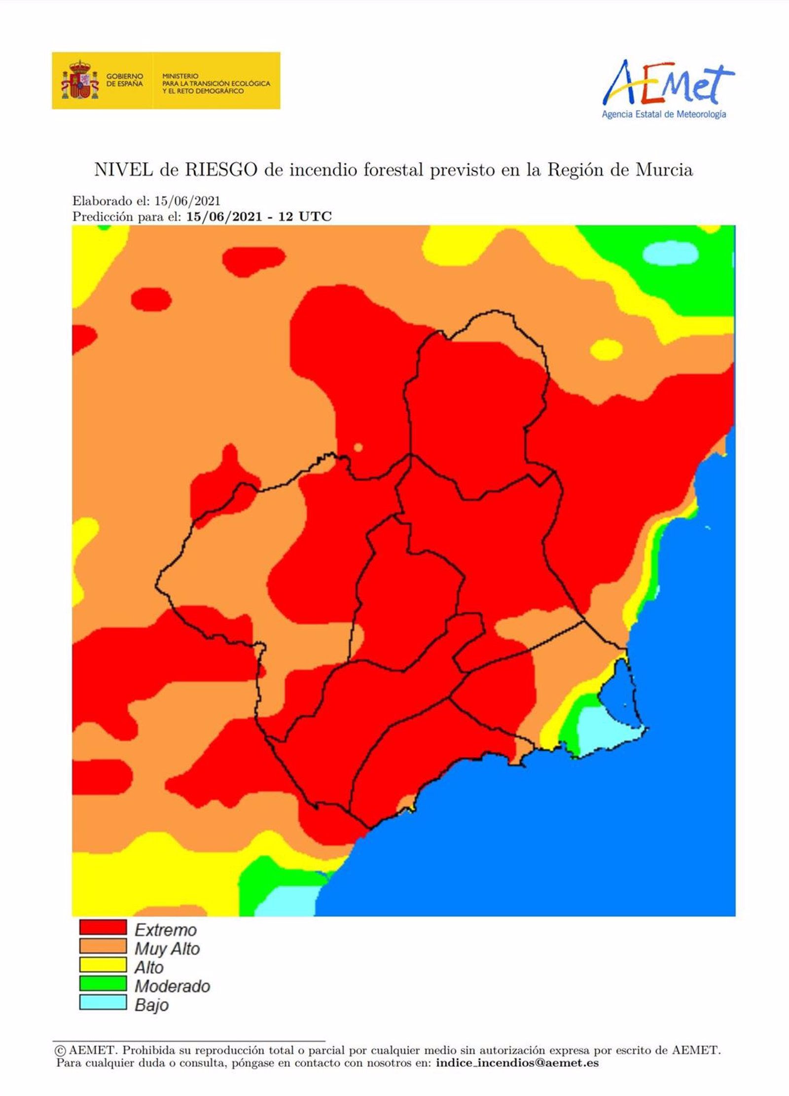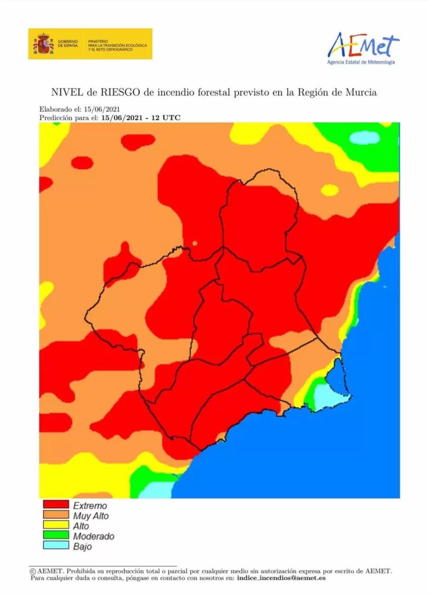 El nivel de riesgo de incendio forestal previsto para este martes por la Agencia Estatal de Meteorología (Aemet) es extremo en toda la Región de Murcia, excepto en el litoral este, donde es muy alto.