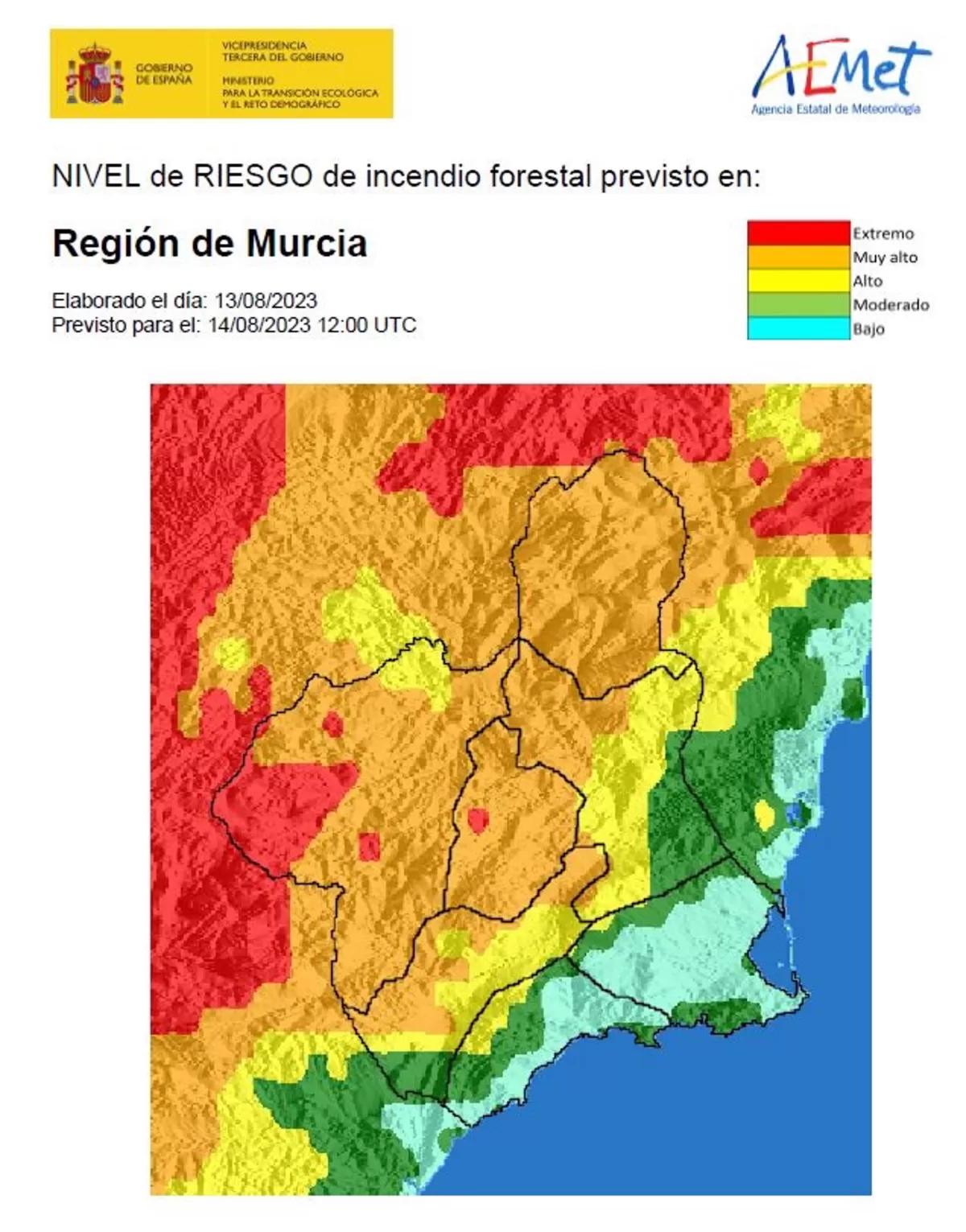 La Agencia Estatal de Meteorología ha establecido para este lunes el nivel de riesgo de incendio forestal muy alto en las comarcas del Noroeste, el Altiplano y la Cuenca de Mula.