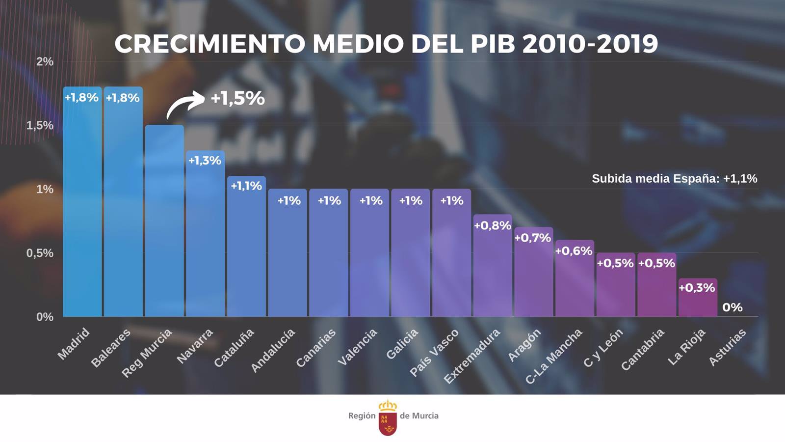 En concreto, la subida media del PIB de la Región durante cada año del periodo 2010-2019 se sitúa en el 1,5 por ciento, una cifra solo superada por la Comunidad de Madrid y Baleares (ambas con un promedio del 1,8 por ciento de subida del PIB), informaron fuentes de la Comunidad en una nota de prensa.