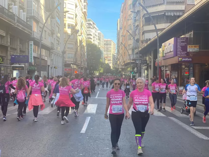 Las participantes han llegado hasta la Plaza Fuensanta, donde giraban para seguir por Martínez Tornel, Glorieta de España, Teniente Flomesta hasta nuevamente la Plaza de la Cruz Roja, donde la línea de meta esperaba a más de 5.000 participantes que gritaban frases de ánimo tras cruzarse con sus compañeras corredoras.