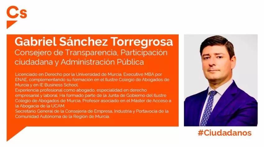 Gabriel Sánchez Torregrosa ha sido nombrado nuevo consejero de Transparencia, Participación ciudadana y Administración Pública en sustitución de la recientemente dimitida Beatriz Ballesteros, según informaron fuentes de la formación naranja.