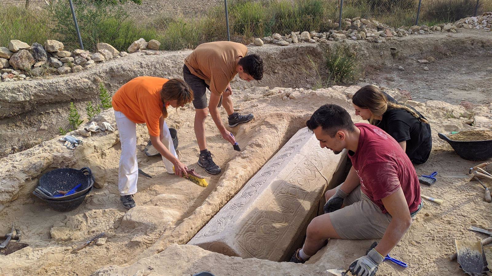 Un equipo de investigación liderado por el profesor de la Universidad de Murcia Rafael González Fernández, catedrático de Historia Antigua, ha descubierto un espectacular sarcófago de época visigoda en el yacimiento de la necrópolis romana de Los Villaricos, en Mula.
