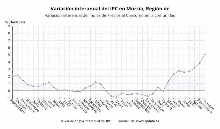 El Índice de Precios de Consumo (IPC) de la Región de Murcia subió un 2,2 por ciento el pasado mes de octubre respecto al mes anterior, mientras que en lo que va de año ese crecimiento se sitúa en el 4,7 por ciento, según datos difundidos este viernes por el Instituto Nacional de Estadística (INE), recogidos por Europa Press.