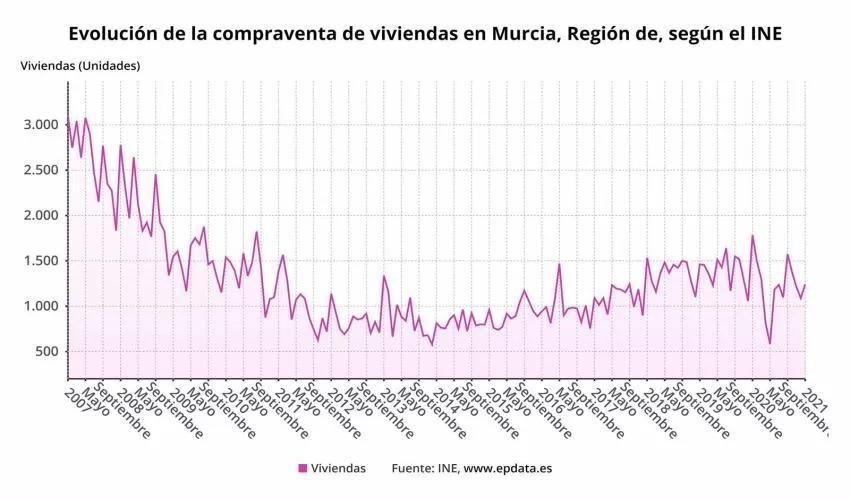 La compraventa de viviendas en la Región de Murcia en el mes de enero descendió un 30,4 por ciento respecto al mismo mes del año anterior, hasta las 1.241 operaciones, superior a la bajada del 15,4 por ciento de la media nacional. Se trata de la segunda mayor caída en España por comunidades, solo inferior a la de Canarias (-52,2 por ciento), según datos publicados este martes por el Instituto Nacional de Estadística (INE).