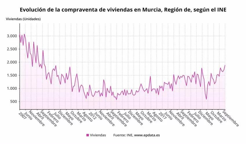 La compraventa de viviendas en la Región de Murcia en el mes de septiembre aumentó un 19,7 por ciento respecto al mismo mes del año anterior, hasta las 1.890 operaciones, inferior a la media del conjunto del país, que creció un 40,6 por ciento, según datos publicados este lunes por el Instituto Nacional de Estadística (INE).