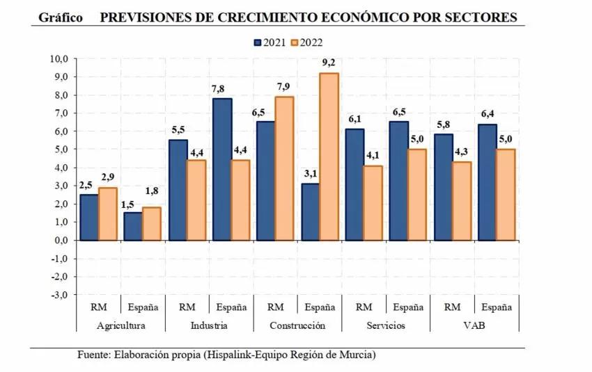 Desde la perspectiva sectorial, en la Región de Murcia, se prevé que en 2021 el mayor crecimiento se registre en las actividades de la construcción con un aumento del 6,5%, seguido del sector servicios con un 6,1%, así como las actividades industriales con una tasa del 5,5% y, en menor medida, el sector agrario con el 2,5%.