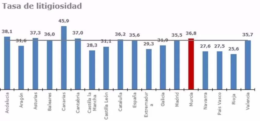 La tasa de litigiosidad en el conjunto del Estado fue de 35,6 asuntos por cada 1.000 habitantes. Entre las comunidades autónomas que en el segundo trimestre del año mostraron una tasa de litigiosidad superior a la nacional están, por este orden, Canarias (45,9), Andalucía (38,1), Asturias (37,3), Cantabria (37), Murcia (36,8) --en quinta posición-,- Cataluña (36,2), Baleares (36) y Comunidad Valenciana (35,7).