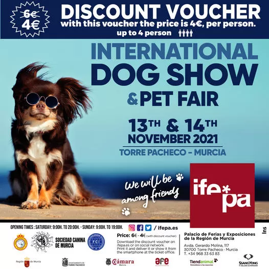 Un total de 19 rings, distribuidos sobre 18.000 metros cuadrados de superficie, despliegan este fin de semana en Ifepa la Exposición Canina, que celebra su 49 edición nacional y la 28 internacional, y el 4º Salón de la Mascota, que fueron inaugurados hoy por el director general de Ganadería, Pesca y Acuicultura, Francisco Espejo, y son organizados por la Sociedad Canina de Murcia e Ifepa, respectivamente.