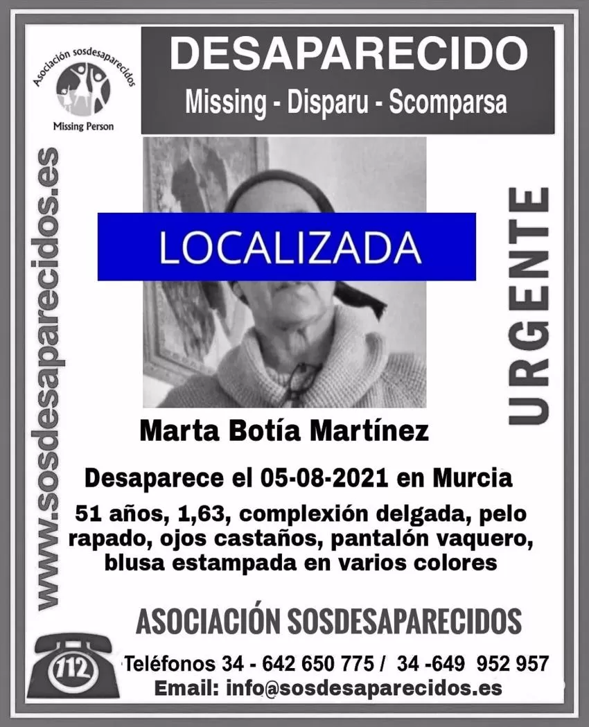 Esta vecina de Murcia, Marta B.M, había sido vista por última vez el pasado jueves. Vestía una blusa estampada en varios colores y un pantalón vaquero. Una vez que ha sido localizada SOS Desaparecidos ha desactivado la alerta.