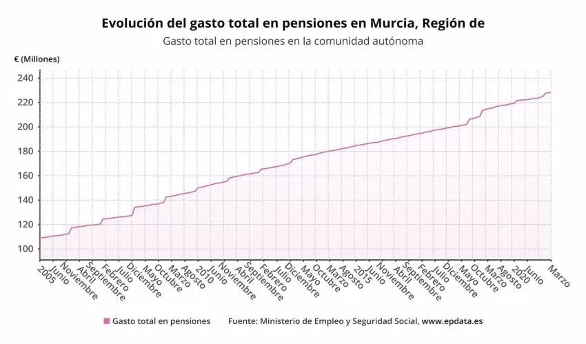 La pensión media en la Región de Murcia que comprende las distintas clases de pensión (jubilación, incapacidad permanente, viudedad, orfandad y a favor de familiares) es de 912,43 euros al mes, la tercera más baja del país, lo que supone 120,6 euros por debajo de la pensión media del Sistema de la Seguridad Social en España, que alcanzó en junio la cuantía de 1.033,03 euros, según datos del Ministerio de Inclusión, Seguridad Social y Migraciones.