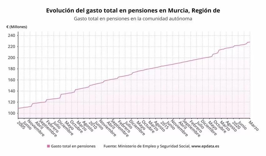 La pensión media en la Región de Murcia, que comprende las distintas clases de pensión (jubilación, incapacidad permanente, viudedad, orfandad y a favor de familiares), es de 915,62 euros al mes, la tercera más baja del país, lo que supone 121,07 euros por debajo de la pensión media del Sistema de la Seguridad Social en España, que alcanzó en septiembre la cuantía de 915,62 euros, según datos del Ministerio de Inclusión, Seguridad Social y Migraciones.
