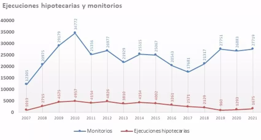Sin embargo, las 1.675 demandas de ejecución hipotecaria registradas el pasado año no alcanzan las más de 2.000 de los años anteriores a la crisis sanitaria, según recoge el informe 'Efectos de la crisis económica en los órganos judiciales', que este viernes ha hecho público la Sección de Estadística del Consejo General del Poder Judicial.