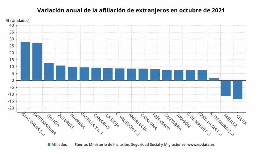 Con respecto al mismo mes del año anterior, la Región de Murcia ha ganado 2.337 afiliados extranjeros, un 2,59% más.