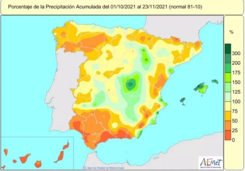 Las lluvias acumuladas desde que el pasado 1 de octubre comenzó el año hidrológico hasta el 23 de noviembre han alcanzado un valor medio en el conjunto de España de 92 litros por metro cuadrado, lo que supone en torno a un 32 por ciento menos que el valor normal para ese periodo, que son 135 litros por metro cuadrado, según ha informado la Agencia Estatal de Meteorología (AEMET).