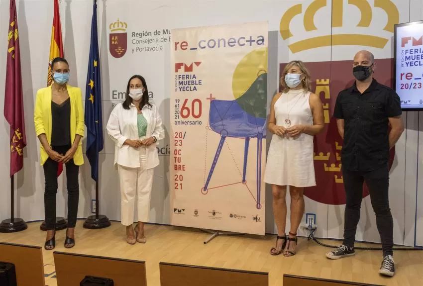 El cartel de la 59 edición de la Feria del Mueble Yecla (FMY), que regresa más 're_conec+ada' que nunca, y que con esta edición celebra sus 60 años de recorrido con la familia del mueble y afines, ha sido presentado este martes 27 de julio en la Consejería de Empresa, Empleo, Universidades y Portavocía.