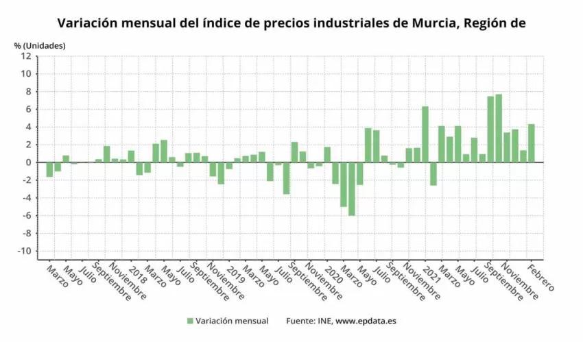 En lo que respecta al mes anterior, los precios industriales aumentaron en la Región de Murcia un 53,8%, también por los efectos de la energía, mientras que la media nacional arrojó un resultado positivo del 41,2%.