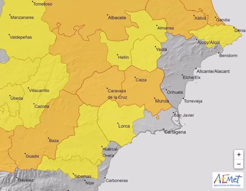 La Agencia Estatal de Meteorología (Aemet) mantiene su aviso de fenómenos meteorológicos adversos de nivel naranja para hoy viernes por temperaturas que pueden llegar a los 40 grados en la Vega del Segura y el Noroeste y aviso amarillo por temperaturas de 39-40 grados en el Altplano y Valle del Guadalentín, Lorca y Águilas.