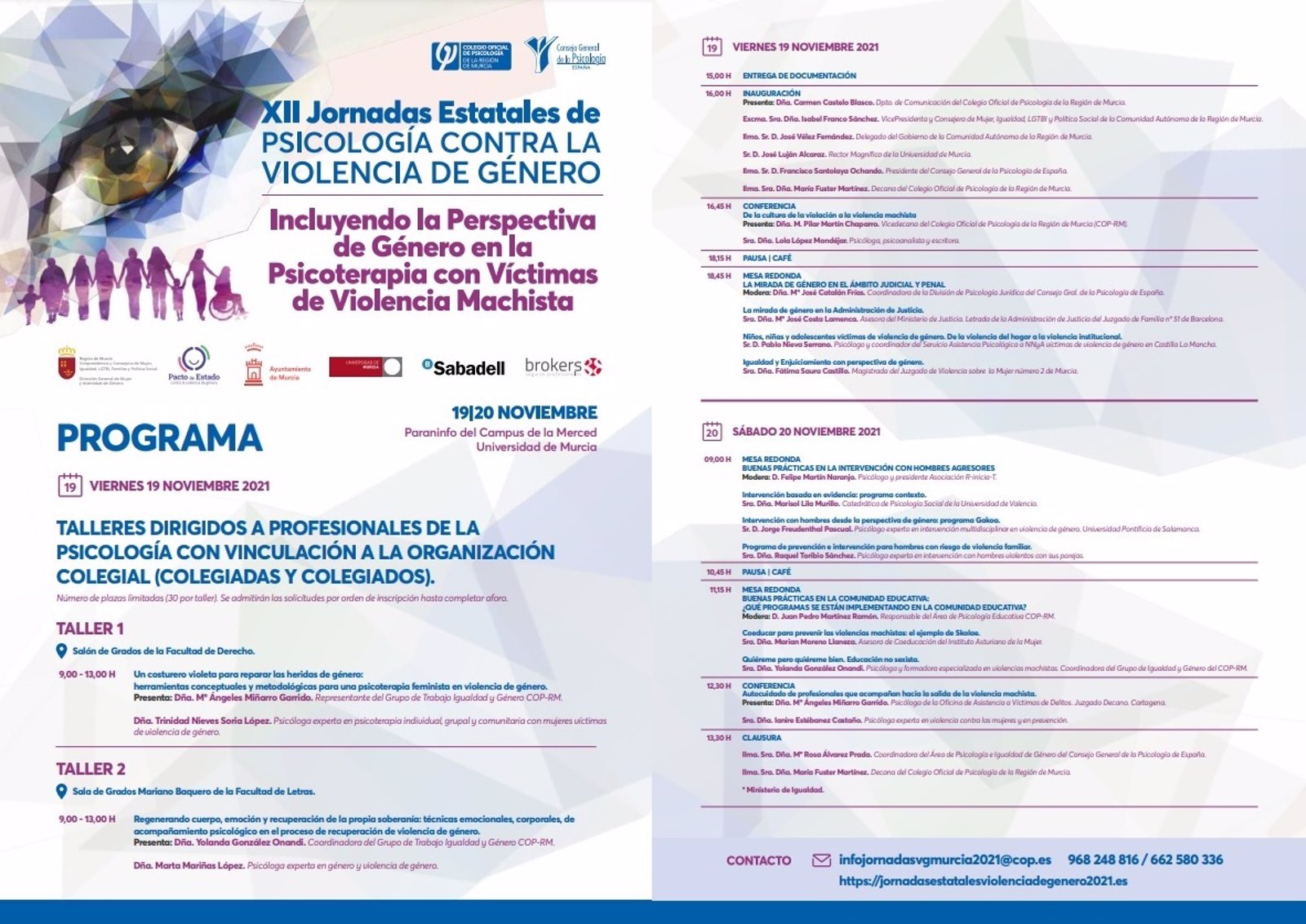 La ciudad de Murcia acogerá este viernes y sábado las 'XII Jornadas Estatales de Psicología contra la Violencia de Género. Incluyendo la perspectiva de Género en la Piscoterapia con Víctimas de Violencia Machista' organizadas por el Colegio General de la Psicología de España y por el Colegio Oficial de Psicología de la Región de Murcia (COP-RM).
