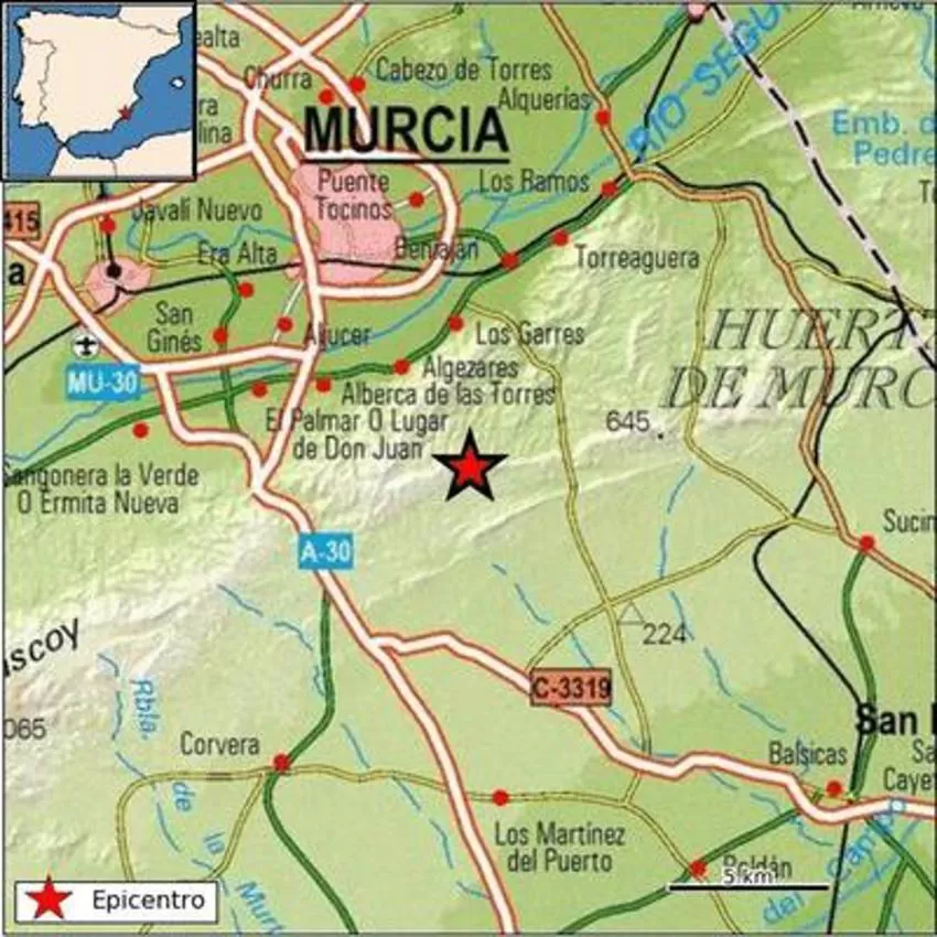 El temblor ha tenido lugar, a las 11.58 horas, y su epicentro se ha localizado a 10 kilómetros de profundidad, en cerca de la pedanía de El Palmar.