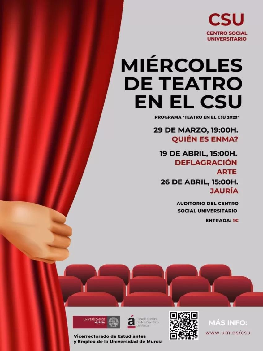 Además de los talleres, el CSU ha organizado un ciclo de teatro que tendrá lugar los miércoles 29 de marzo, 19 y 26 de abril en el auditorio del Centro Social Universitario en colaboración con la Escuela Superior de Arte Dramático de Murcia.