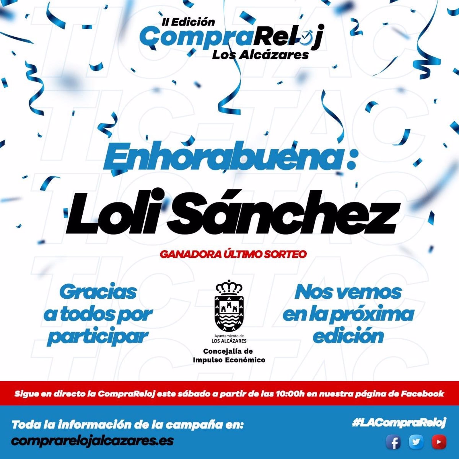Este tercer sorteo, que ha elegido como premiada a Loli Sánchez, fue realizado el pasado martes, a las 13.00 horas. El momento y la forma de gastar ese cheque por valor de 1.000 euros está delimitado en las bases legales del sorteo (que se pueden consultar en la página web creada al efecto https://comprarelojalcazares.es), un sorteo que ha sido supervisado por el equipo de la agencia 2VM (https://dosvecesmarketing.com) creadora de la campaña.