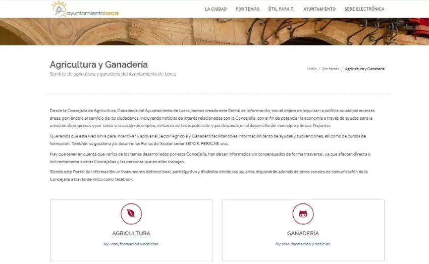 "Un portal, https://www.lorca.es/agriculturayganaderia.asp?id=209, que incluye información sobre ayudas y subvenciones, cursos de formación, así como enlaces a otras webs de interés como las ferias SEPOR y FERICAB, o las páginas web del Ministerio de Agricultura y la Consejería de Agricultura y Ganadería de la Región de Murcia", añade.