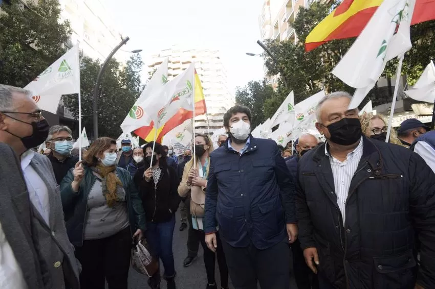El presidente de la Comunidad, Fernando López Miras, ha afirmado este miércoles, durante la manifestación por las calles de la ciudad Murcia de las principales organizaciones agrarias y ganaderas, que el Gobierno de España y Pedro Sánchez "deben escuchar el grito desesperado" que lanza la Región de Murcia y "tomar buena nota".