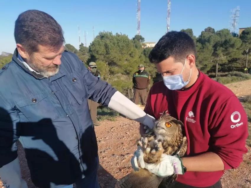 Un ejemplar de búho real, localizado el pasado 5 de enero cuando se encontraba enganchado en el extremo de un cercado en una zona agrícola cercana al paraje de Casas Altas, en Alhama de Murcia, fue liberado hoy tras ser sometido a tratamiento y rehabilitación en el Centro de Recuperación de Fauna Silvestre de la Comunidad Autónoma de El Valle.