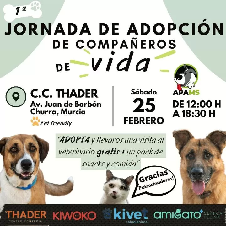 De 12 a 18, todo aquel que se acerque a este centro comercial puede donar pienso, mantas, medicamentos, antiparasitarios, productos de higiene, y distintos accesorios para las mascotas que esperan tener un hogar con el objetivo de visibilizar su labor y fomentar la adopción de mascotas. Esta jornada se puede llevar a cabo gracias a la colaboración empresas como Kiwoko, Kivet Clínicas Veterinarias, Amigato Clínica Felina y el Centro Comercial Thader. En este punto se podrán adquirir pulseras o llaveros solidarios.