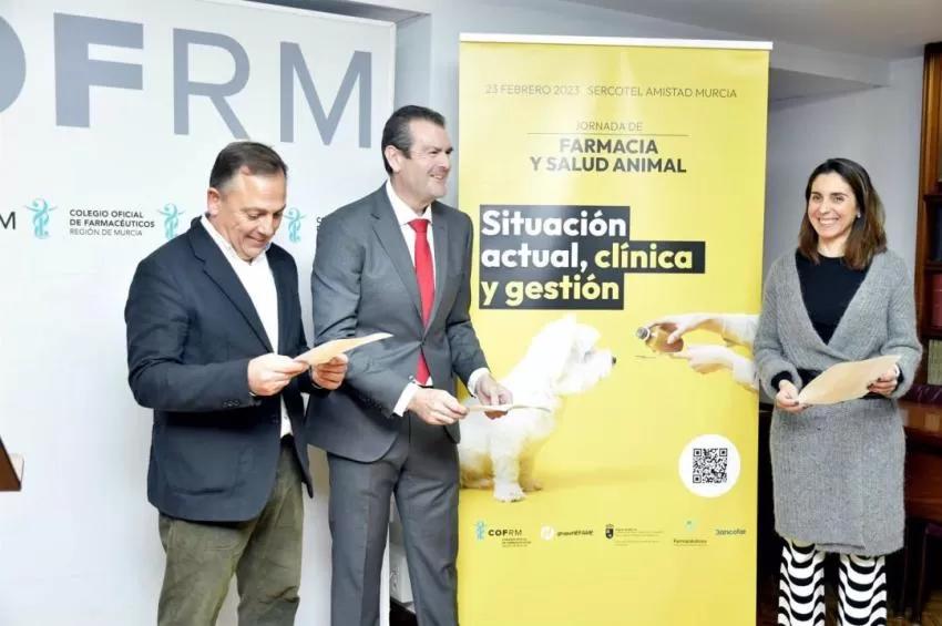 La presidenta del Colegio de Farmacéuticos, Paula Payá, el presidente de Hefame, Enrique Ayuso, y el director general de Agua, Agricultura, Ganadería y Pesca, Francisco J. Espejo, han presentado la Jornada 'Farmacia y Salud Animal' que analizará la situación actual sobre la clínica y la gestión de los medicamentos de uso para mascotas.