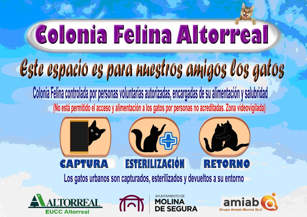 Esta iniciativa surge de una moción aprobada por el Pleno Municipal el pasado mes de julio para mejorar el Programa de Control de las Colonias Felinas en el municipio. Se ha colocado, en la Plaza de la Huertana de Altorreal, una caseta refugio, una valla alrededor de protección y un cartel con la información y normativa de la colonia, regalada por la empresa Amiab, Entidad Asociativa Nacional de Economía Social declarada de utilidad pública.