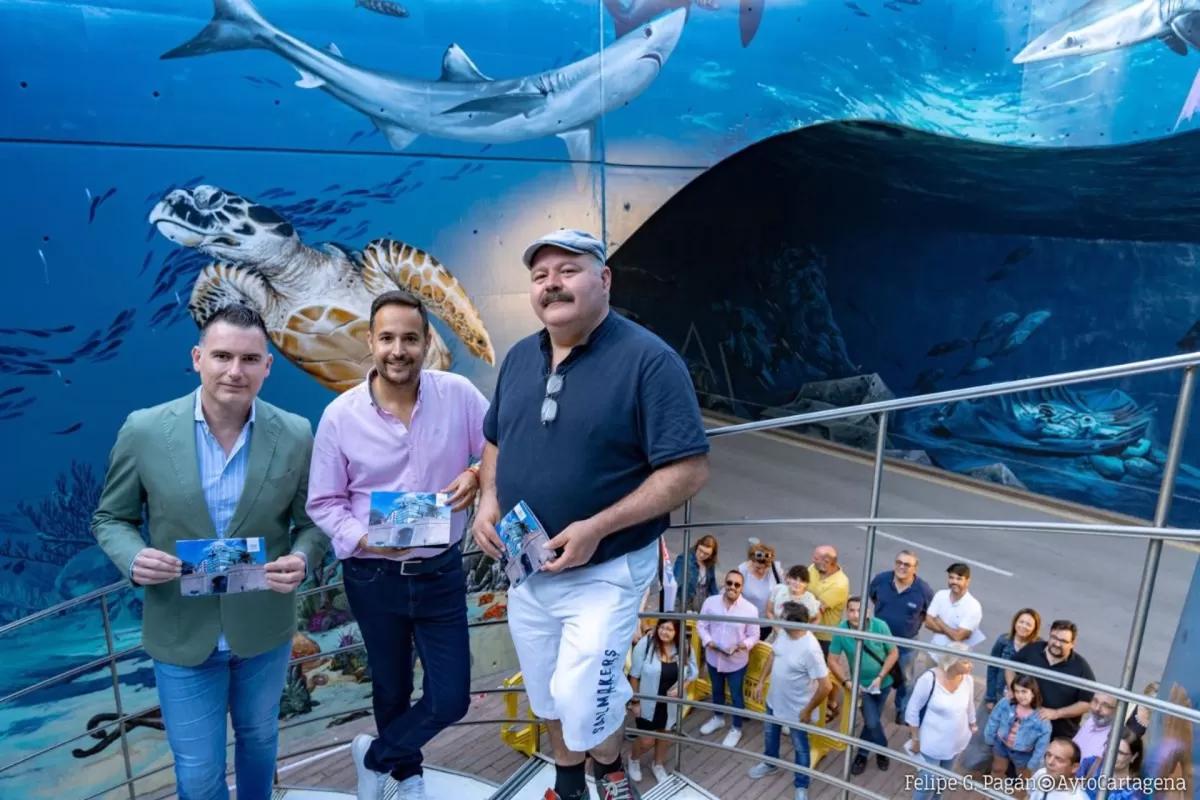 El artista urbano Kraser presentó este lunes, 5 de junio, el catálogo de su intervención pictórica 'Inflexión Acuática', un gran mural que ha plasmado este cartagenero reconocido a nivel internacional en las escaleras y el túnel de la calle Gisbert. El acto contó con la presencia de los ediles en funciones de Cultura, David Martínez y Carlos Piñana.