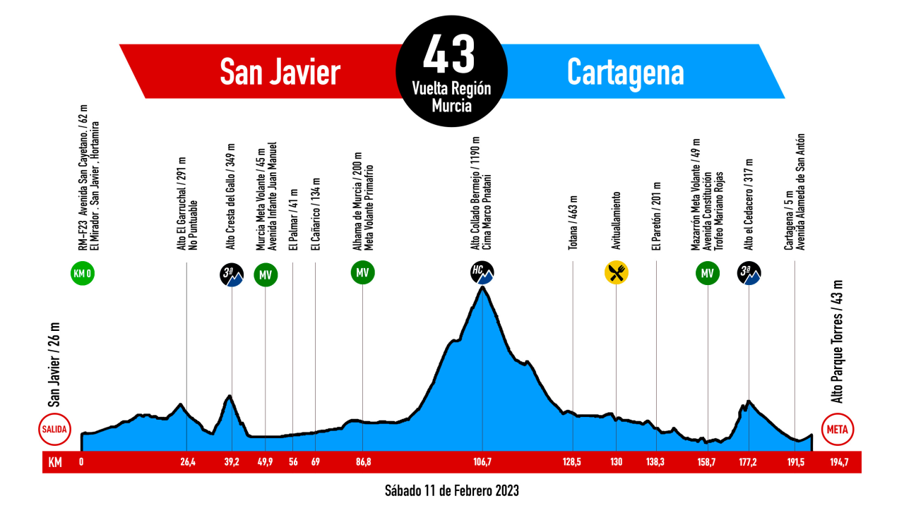 Cartagena será el final, por segundo año consecutivo, de la Vuelta Ciclista a la Región de Murcia “Costa Cálida”-Gran Premio Primafrio. El recorrido, como es habitual en la carrera, será muy exigente. Serán 194,7 kilómetros, con tres puertos de montaña puntuables, tres metas volantes y un final en alto inédito en el Parque Torres.