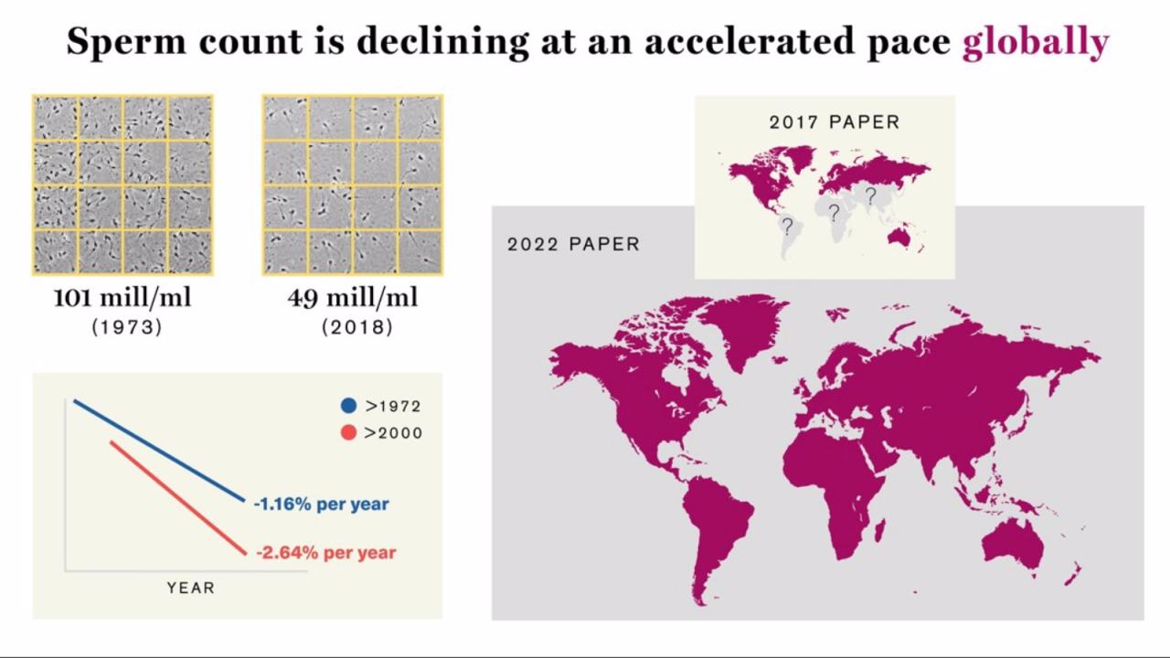 Además, este estudio muestra que la declinación ha sido mucho mayor a partir de la entrada en el nuevo siglo. Como ha resumido Hagai Levine, investigador líder del proyecto: "En general, estamos viendo una disminución mundial significativa de los recuentos espermáticos de más del 50% en los últimos 46 años, una disminución que se ha acelerado en los últimos años".