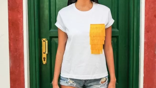 Los flecos son uno de los tipos de decoraciones que aunque es muy antiguo no pasa de moda, se trata de ligeras tiras de tela que sobre salen ya sea de una manga, del borde inferior de la camiseta e incluso desde un simple bolsillo.