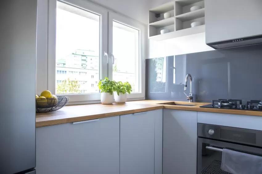 Tal y como sucede con los colores, si se usan aquellos que son oscuros la cocina se verá menos espaciosa, es lo mismo que sucede con el vidrio. Si se decora con adornos con este material la misma se verá más grande.