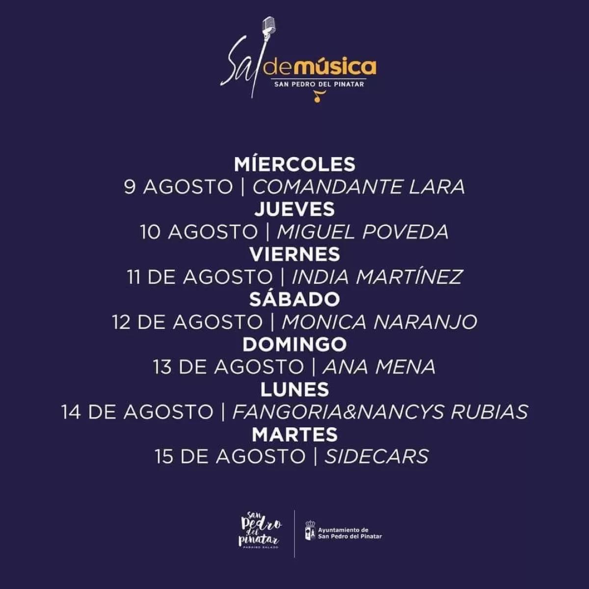 Miguel Poveda, India Martínez, Mónica Naranjo, Ana Mena, Fangoria, Nancys Rubias y Sidecars son algunos de los grupos y artistas musicales que actuarán en la segunda edición del festival 'Sal de Música', organizado por el Ayuntamiento de San Pedro del Pinatar entre el 9 y el 15 de agosto.