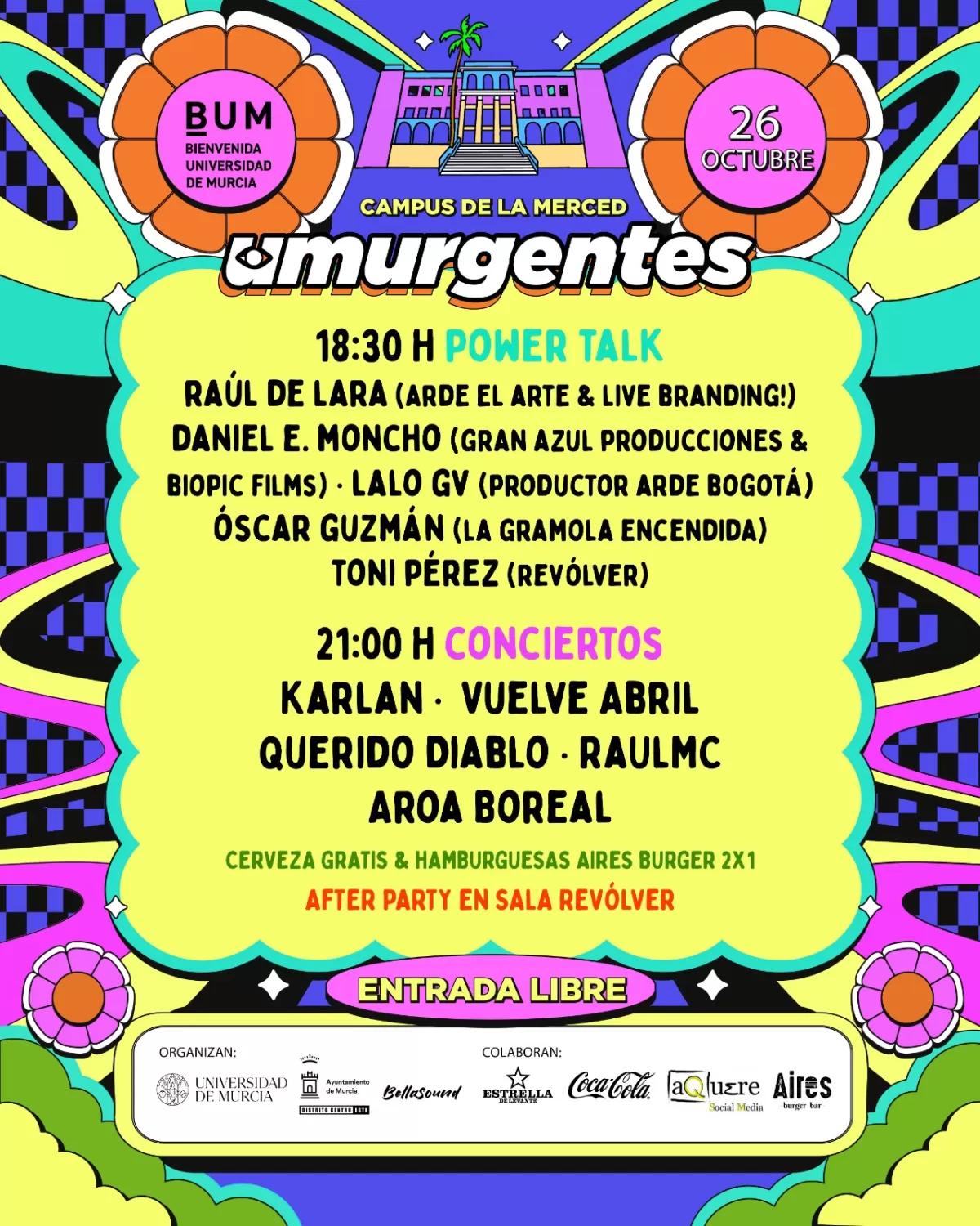 Umurgentes está organizado gracias a la colaboración con la Junta Municipal del Distrito Centro Este y gestionado por Bellasound. La música comenzará a asonar a las nueve de la noche en el patio del Campus de la Merced.