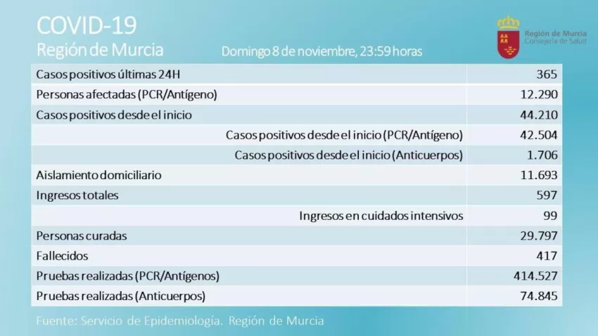 El número total de afectados por Covid-19 en la Región de Murcia desde el comienzo de la pandemia se sitúa en 44.210 casos, de los que 42.504 han sido acreditados mediante PCR o test de antígenos, y 1.706 a través de pruebas de anticuerpos.