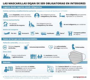 En cualquier caso, los españoles aún no se desprenderán del todo de la mascarilla, ya que seguirá siendo obligatoria en determinados ambientes, "en razón de la vulnerabilidad" de las personas que los suelen ocupar.