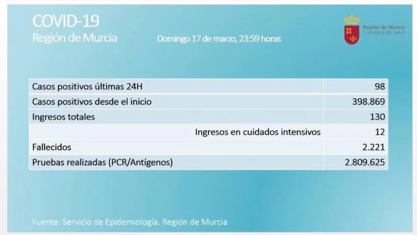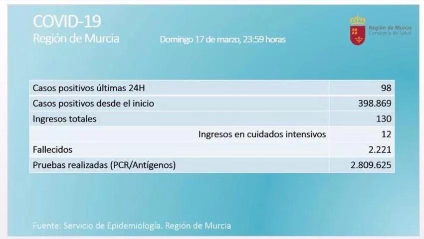 La Región de Murcia ha registrado en las últimas 24 horas un total de 98 casos nuevos de coronavirus y un fallecido por esta causa, según refleja la página web de la Consejería de Salud.